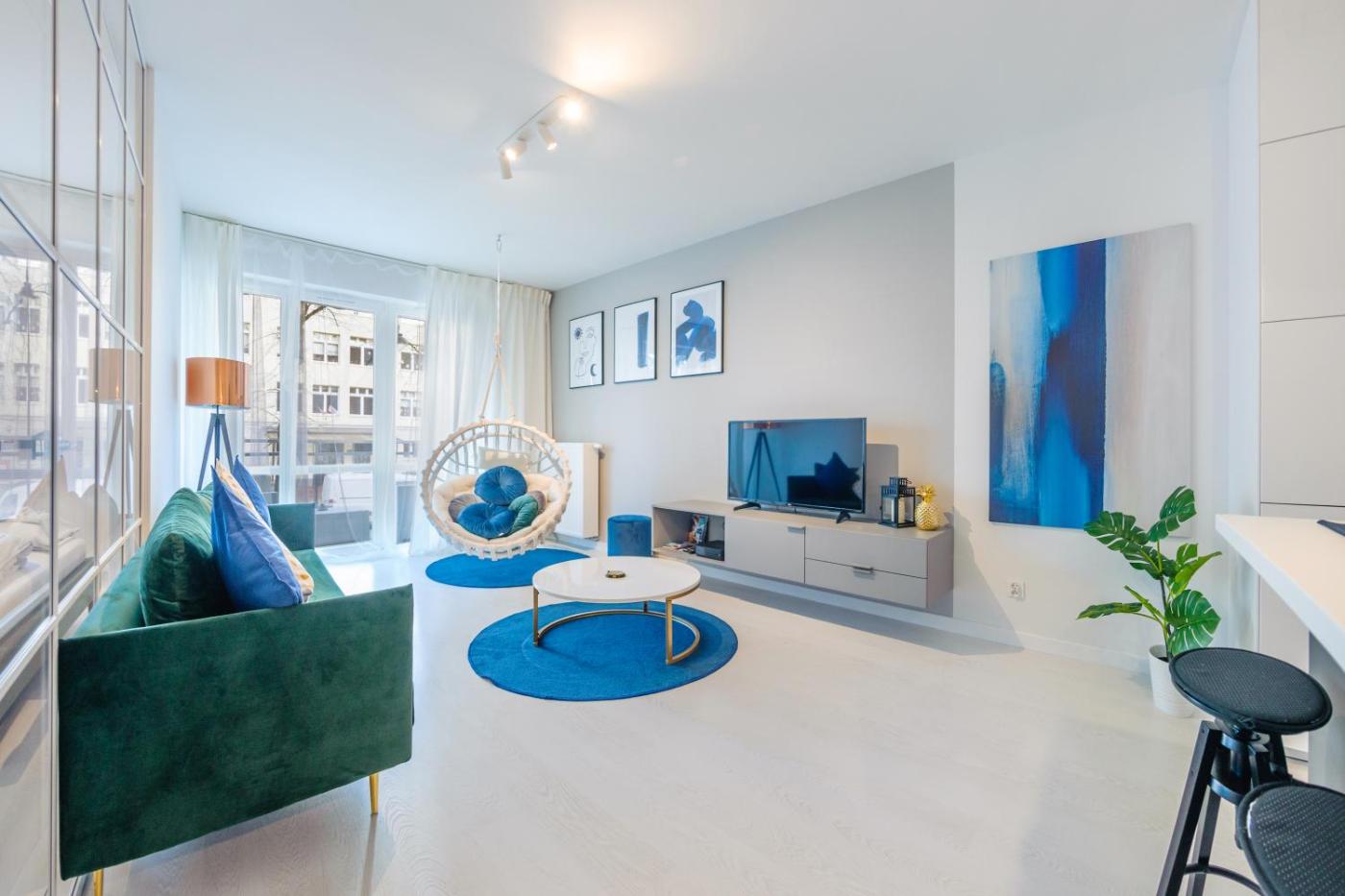 Apartament z 1 sypialnią. Apartament ten mieści salon, oddzielną sypialnię oraz łazienkę z prysznicem i suszarką do włosów. Goście mogą samodzielnie przygotowywać posiłki w aneksie kuchennym z płytą kuchenną, lodówką, zmywarką do naczyń i przyborami kuchennymi. Apartament wyposażony jest w pralkę, ekspres do kawy oraz telewizor z płaskim ekranem i dostępem do kanałów kablowych. Goście mają do dyspozycji balkon. W tej opcji zakwaterowania zapewniono 2 łóżka. Apartament - 4 osobowy. Powierzchnia pokoju ok.: 45 mkw. ;