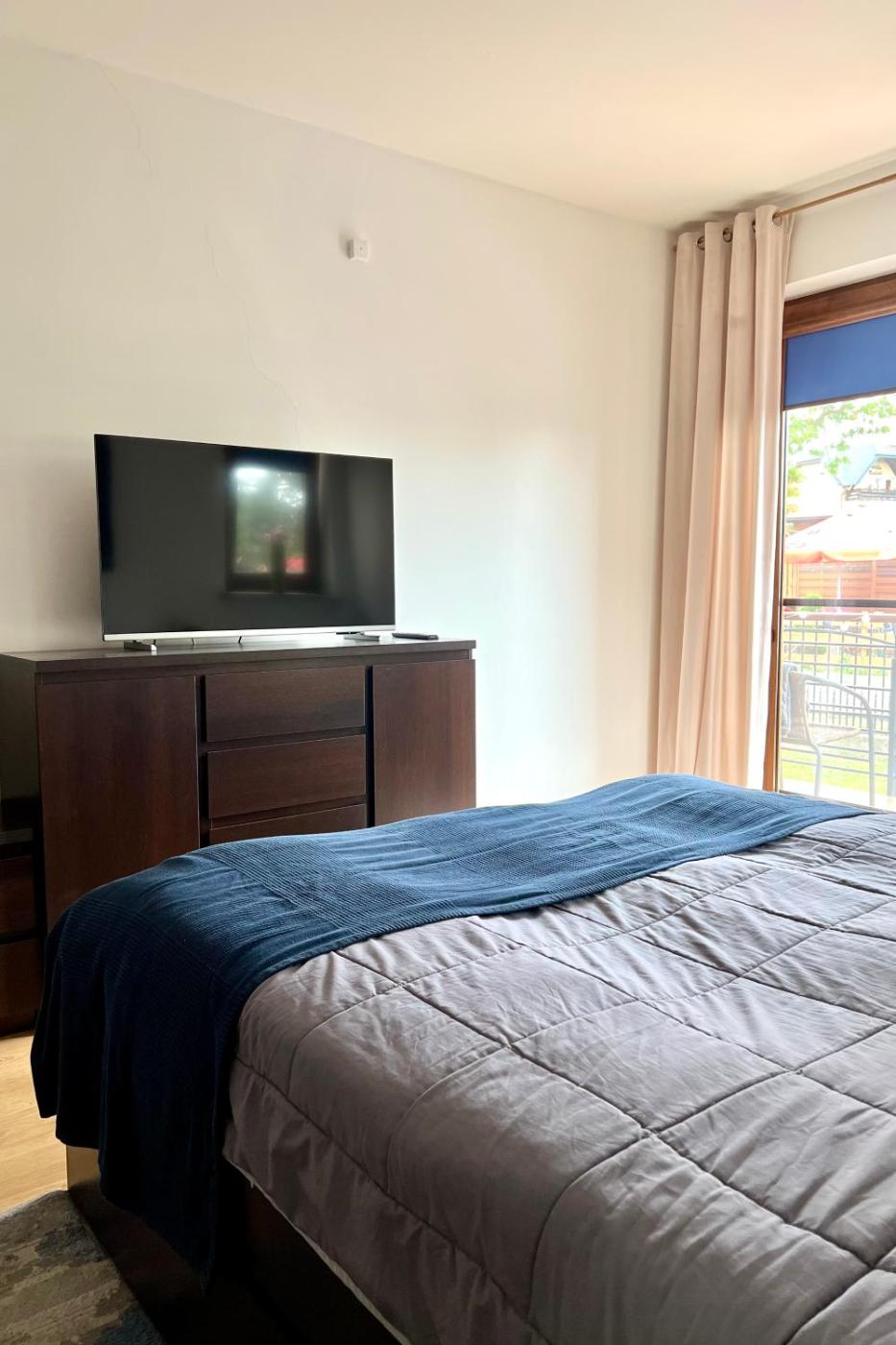 Apartament z 1 sypialnią. In the well-equipped kitchenette, guests will find a stovetop, a refrigerator, kitchenware and a microwave. The apartment features a private entrance, a tea and coffee maker, a balcony with garden views as well as a shared bathroom boasting a shower. The unit has 3 beds. Apartament - 4 osobowy. Powierzchnia pokoju ok.: 49 mkw.
